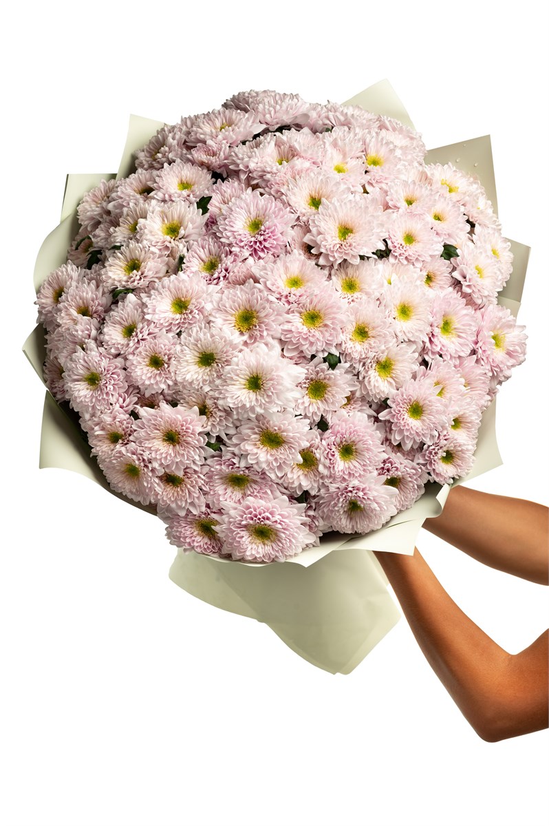 Букет из 25 нежно-розовых хризантем (Коммандер Пинк) в оформлении