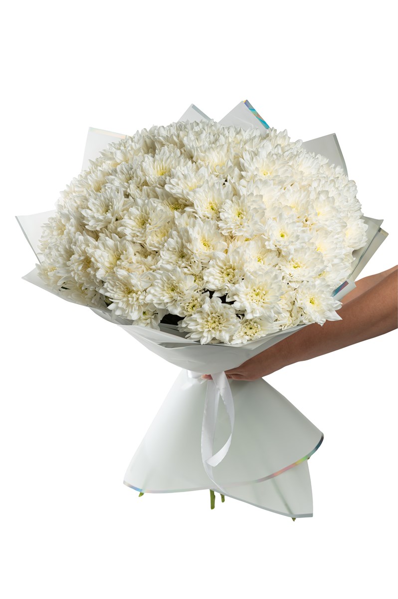Букет из 25 белых кустовых хризантем (Балтика) в оформлении