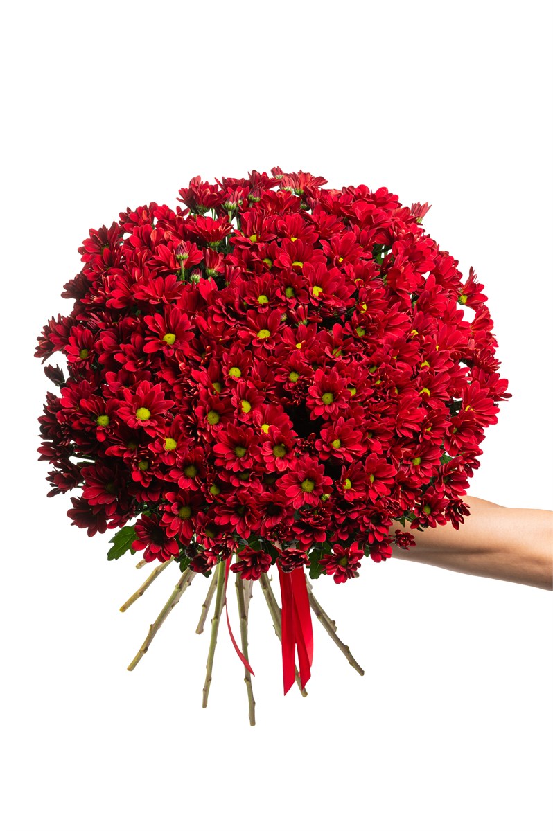 Букет из 25 красных кустовых хризантем (Бонтемпии) с лентой.