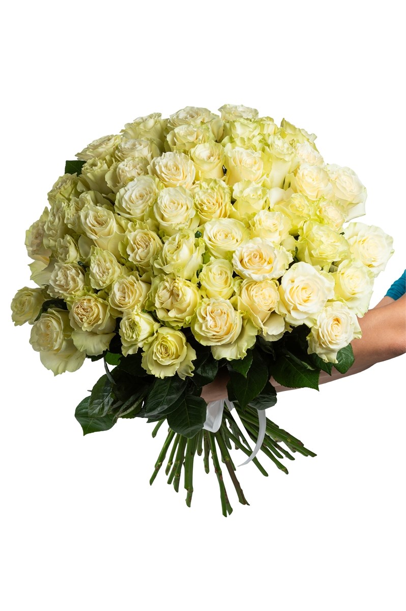Букет из 51 белой розы (Эквадор) 50 см "Мондиаль" с лентой