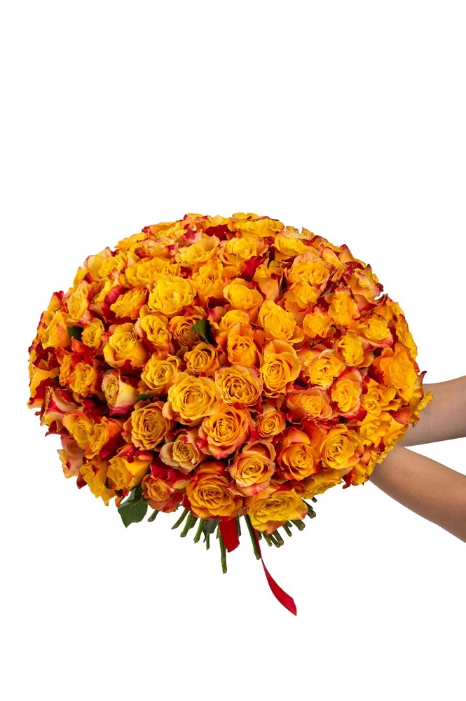 Букет из 101 красно-желтой розы (Кения) 40см с лентой