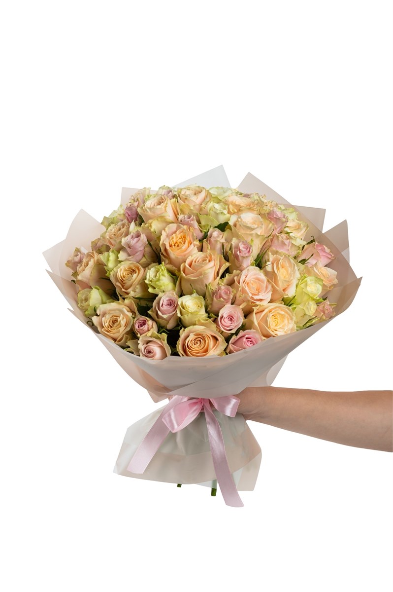 Роза кения микс 51 штука + оформление - это великолепный букет из нежных оттенков цветов, которые передают заботу и тепло о близком Вам челевеке. Оформление отлично дополняет букет и придает ему свой неповторимый шарм. Подарите яркость и красоту с Розой. Будьте уверены, что ваш подарок станет особенным и запоминающимся для того, кто его получит.